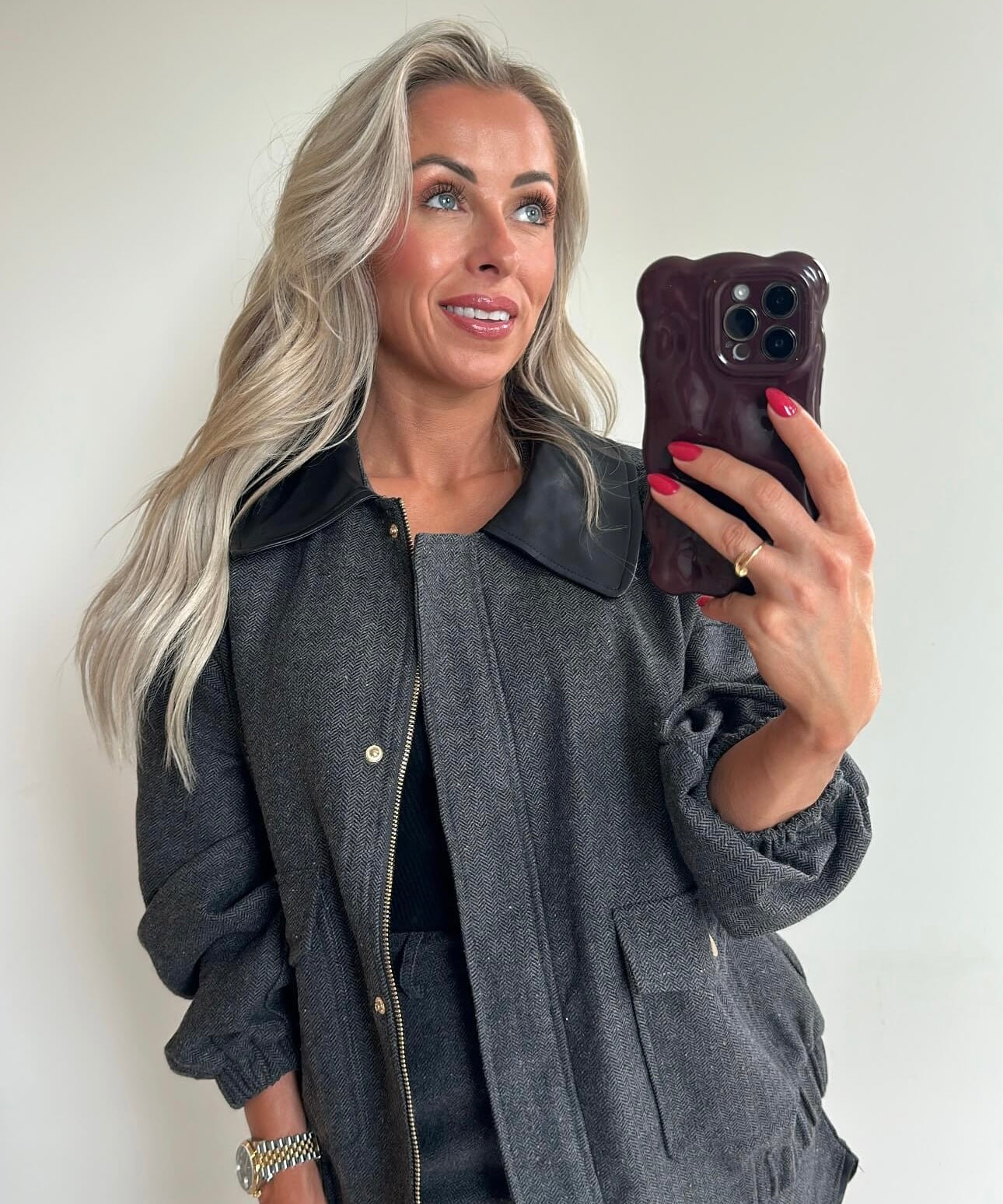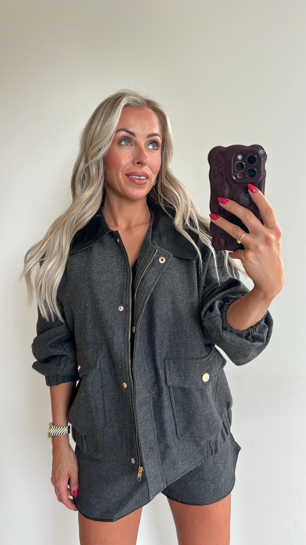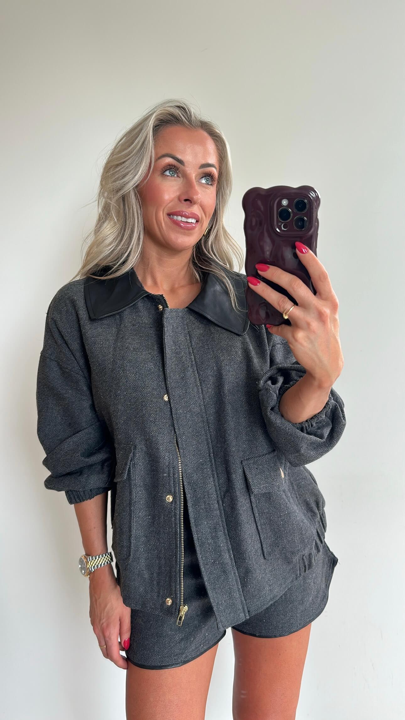 De MARIELLE Set is echt een super fancy setje! De mooie grijze stof is afgewerkt met zwarte leather look details en dit zowel aan het shortje als het bombertje! Combineer beide items van de set ook gerust apart!