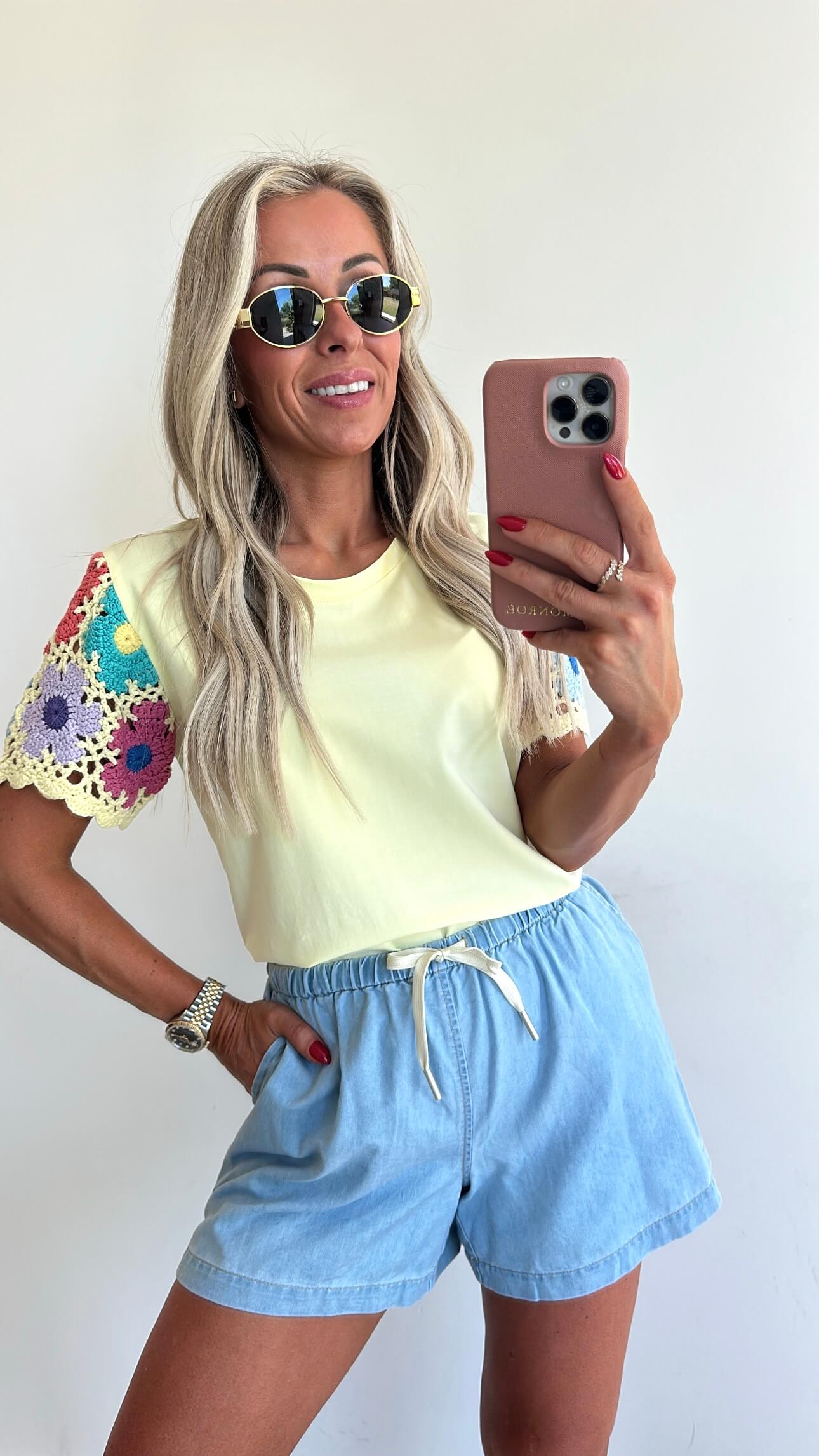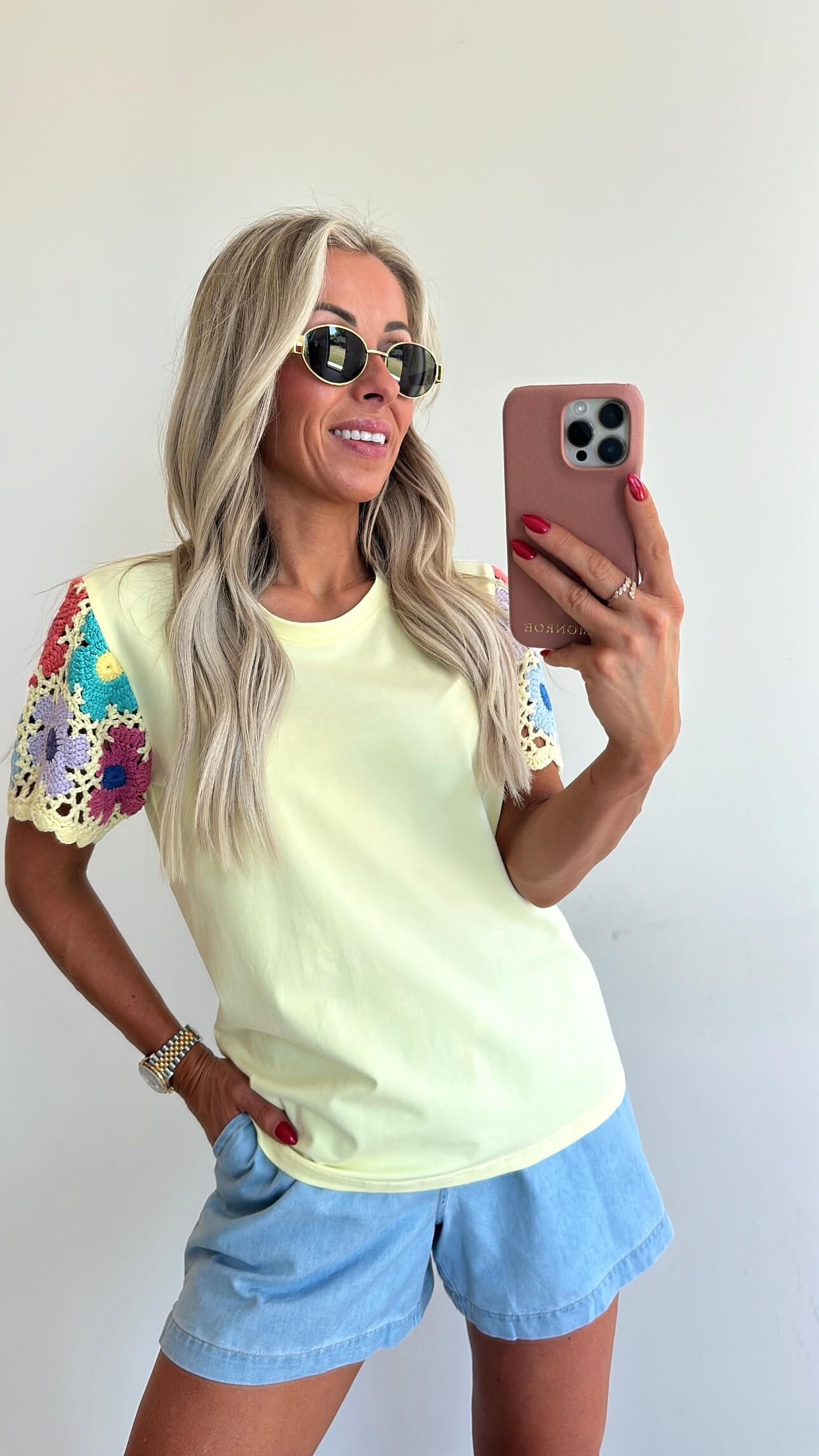 De SUMMER T-shirt is een echte musthave voor deze zomer. De mouwen zijn prachtig afgewerkt in crochet en de mooie kleurtjes maken van deze top een echte eyecatcher!
