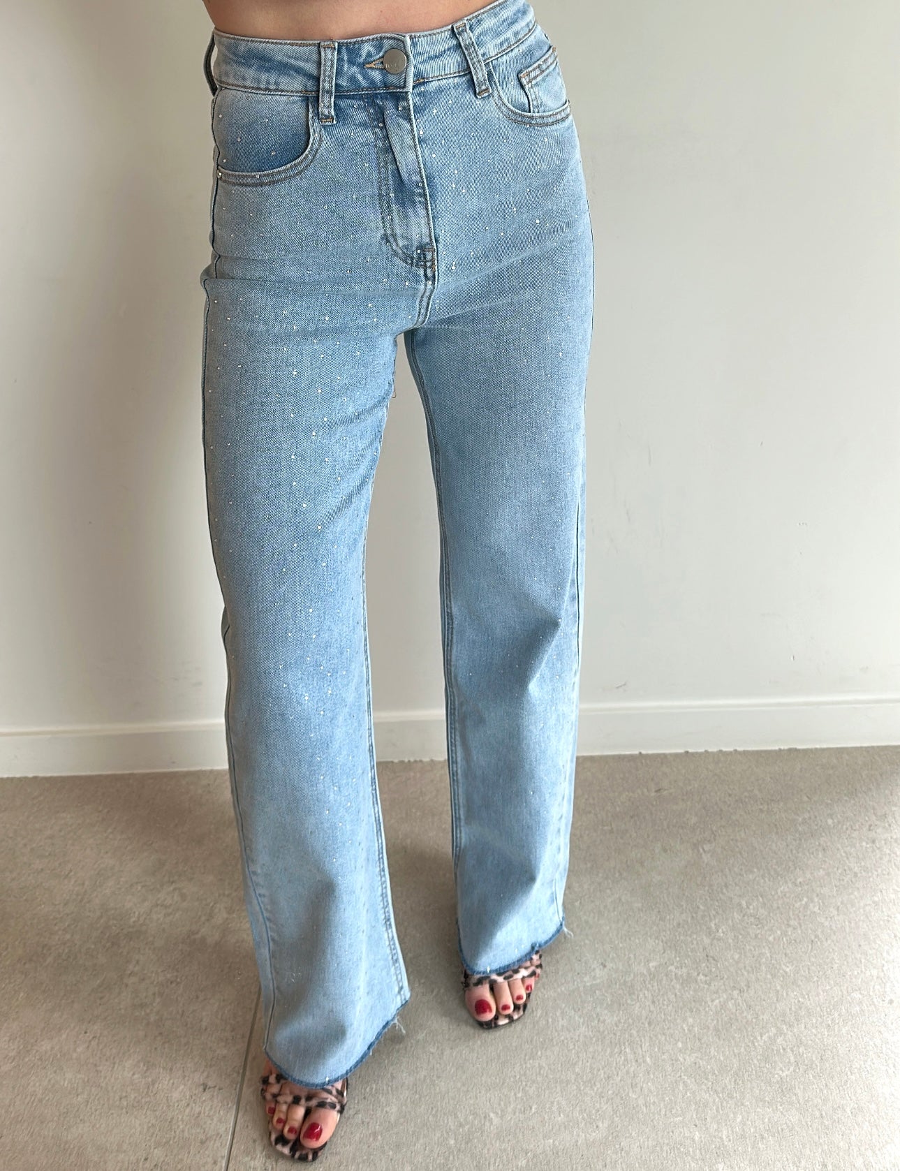 Kleur: lichtblauwe jeans met steentjes vooraan